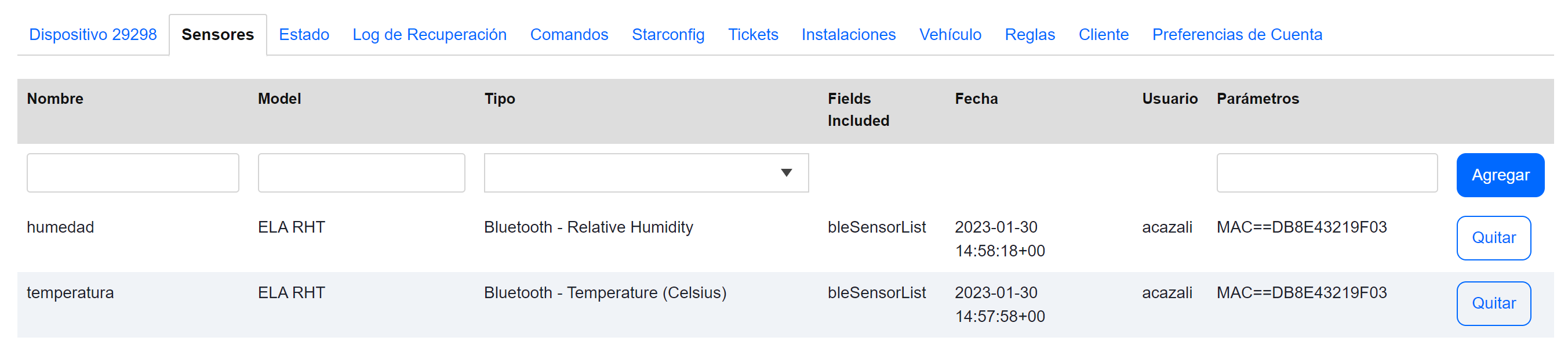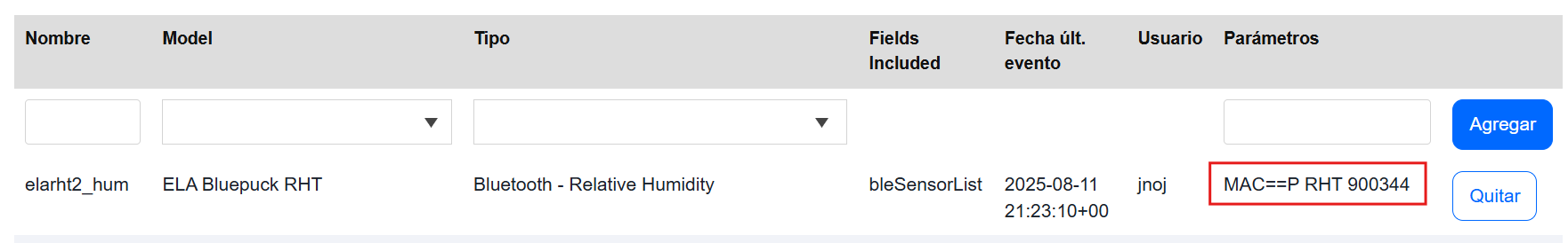 Los equipos GPS de la marca Ruptela no reconocen los sensores ELA al configurarlos usando la dirección MAC, únicamente con el nombre (ID) del sensor. Por lo tanto, en la plataforma los sensores también deben configurarse usando el id. Por ejemplo, si el ID es P RHT 900344 se debe escribir MAC==P RHT 900344 como se muestra en la imagen a continuación: