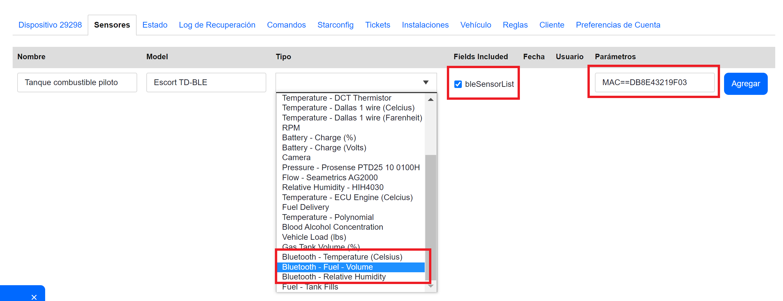Para configurarlos es necesario agregar 1 sensor por variable al dispositivo de rastreo como se puede ver en la imagen siguiente