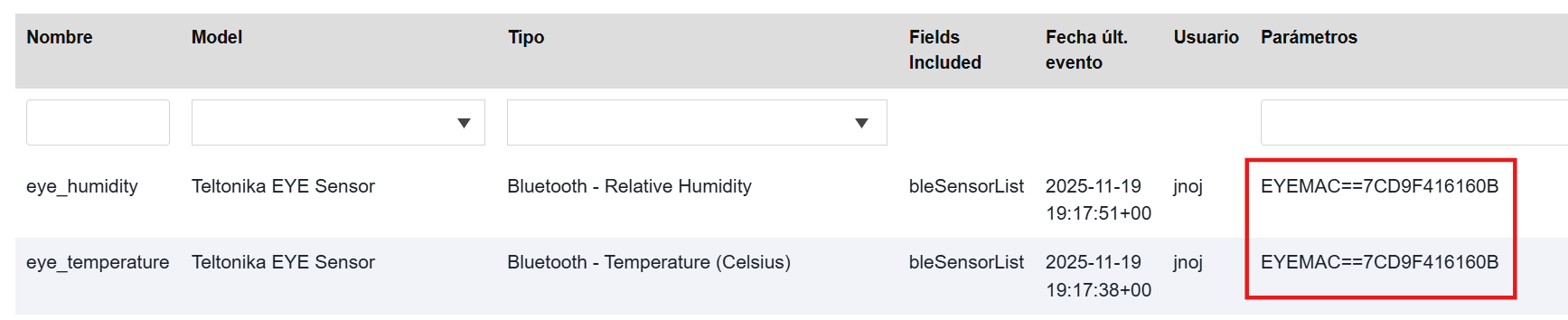 Estos sensores deben configurarse usando el parámetro EYEMAC en lugar de solo MAC. Por ejemplo, si la MAC de un EYE Sensor es 7CD9F416160B se debe escribir EYEMAC==7CD9F416160B, tal como se muestra en la imagen a continuación: